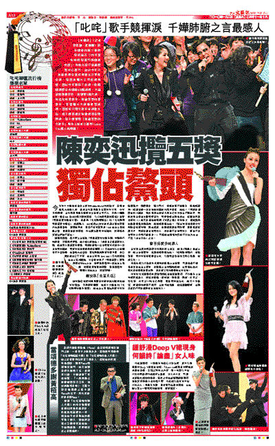 【本報訊】(記者 李思穎、黃佩麗)商台頒發的第二張樂壇成續表「09年度叱爧祩竅y行榜頒獎典禮」,昨晚在灣仔會議展覽中心舉行,由於今年只有縱貫線合資格角逐生力軍組合獎,但因其唱片公司拒絕角逐,因此今年取消了該獎。整個頒獎禮合共頒發48個獎項,大贏家則是陳奕迅,他連奪5個大獎,包括叱蠿k歌手、我最喜愛的男歌手、至尊唱片大獎等重要獎項。容祖兒只得女歌手金獎較失色,楊千嬅和謝安琪雖然都各得兩獎,但千嬅奪得「我最喜愛的女歌手」時台上對老公高呼I Love You感人搶晒鏡!