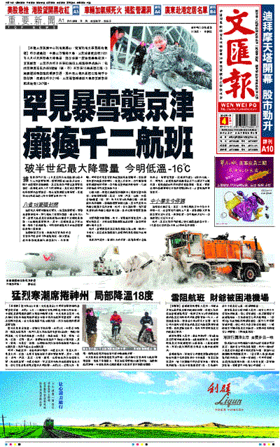 氣象部門表示,直到今天前半夜,這場降雪才會逐漸停止。降雪結束後,京城將吹起5、6級的大風,今、明兩天,最低氣溫將迅速降至零下15到零下16攝氏度,從而逼近40年來的歷史低溫極值。據悉,雪後出現的這種極端冷天氣將持續3到4天,之後氣溫將略有回升。