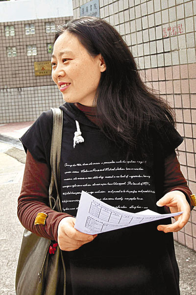 ■梁太昨到「新英中」景嶺書院取中一申請表,她認為該校校風良好,且新學年中一可全英語教學,有利女兒未來升學就業。本報記者彭子文 攝