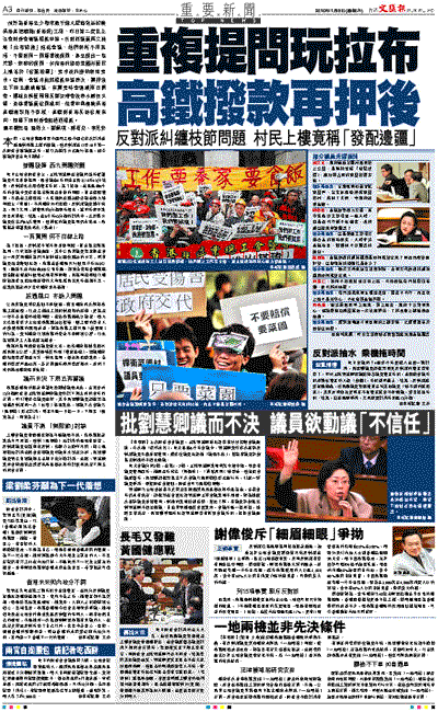 預計為香港至少帶來數千億元經濟效益的廣深港高速鐵路(香港段)工程,昨日第二度在立法會財委會審議撥款申請。反對派議員再次施展「拉布戰術」拖延會議,他們無所不用其極,不單對同一問題重複提問,甚至提出一些荒謬、無聊的提問,如指港府協助菜園村居民上樓等於「發配邊疆」,要求政府接納無理要求。結果,會議未能就撥款申請表決,需押後至下周五繼續審議,有需要時會連續兩日開會。運輸及房屋局局長鄭汝樺會後表示感到失望,並尊重議員發問權利,但重申興建廣深港高鐵建設刻不容緩,高鐵對香港長遠發展有利,期望下周財委會能通過撥款。