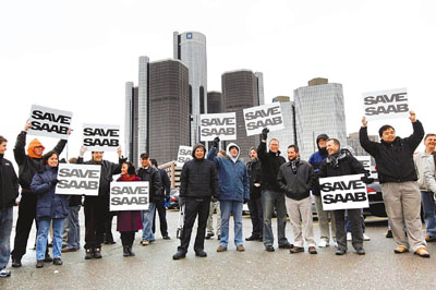 ■底特律工人在通用汽車公司總部外示威,促請挽救紳寶。 美聯社