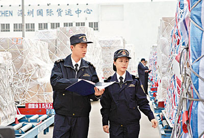 ■深圳海關關員正在認真核對物流企業貨物 李安 攝