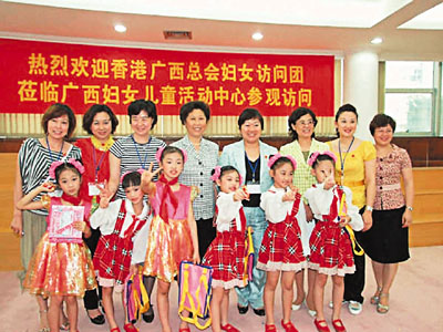 ■2009年中聯辦九龍工作部王小靈處長(左三)、自治區政協蔣培蘭副主席(左四)、廣西社總常務副會長王惠貞(左五)及副會長蒙美玲(右二)到訪自治區婦女委員會兒童活動中心,與參與表演的兒童合照。