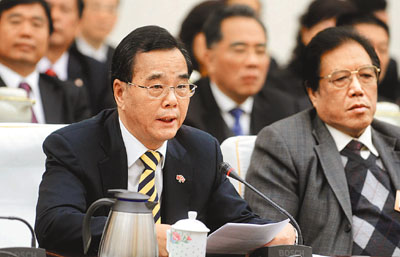 ■全國政協委員、香港福建社團聯會主席林樹哲(左)發言。 中新社