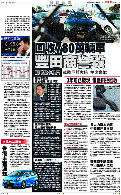 日本豐田車廠接連傳出質量問題,從去年至今宣布全球回收汽車已接近780萬輛,相當於車廠去年全年總銷量。為挽回消費者信心,主席豐田章男前日首次公開露面,向受影響顧客致歉。不過分析認為,事件已重挫豐田「安全至上」的金漆招牌,銷情肯定大受打擊,甚或面臨巨額索償。