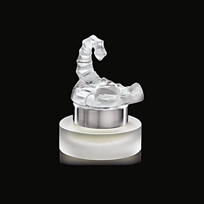 高級水晶品牌Lalique今年推出香水系列,除了帶來獨特的香氣外,還有猶如藝術品的香水瓶。這款限量版男士香水,靈感來自蠍子的形態。瓶蓋以蠍子尾為造型,明顯的骨骼及各個部位均以透明水晶勾勒出來。磨砂的表面處理增添了高貴感。內藏由阿爾卑斯薰衣草、迷迭香、茉莉、鳶尾花結合的花香主調,加上濃烈的弗吉尼亞雪松木的襯托,獨特的氣息,帶出男士優雅魅力。