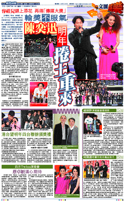 【本報訊】(記者 李思穎)港台「十大中文金曲頒獎音樂會」前晚順利完成,各獎項已塵埃落定,一直備受爭議的「傳媒大獎」最終落在容祖兒手上,她以合共19個獎、多出3個獎的優勢拋離陳奕迅(Eason)成為終極大贏家。Eason在版稅風波影響下,無奈飲恨,輸得不服氣的他直指祖兒得獎時略欠氣氛,也未能打破他奪得21個獎的紀錄,揚言明年會繼續努力。