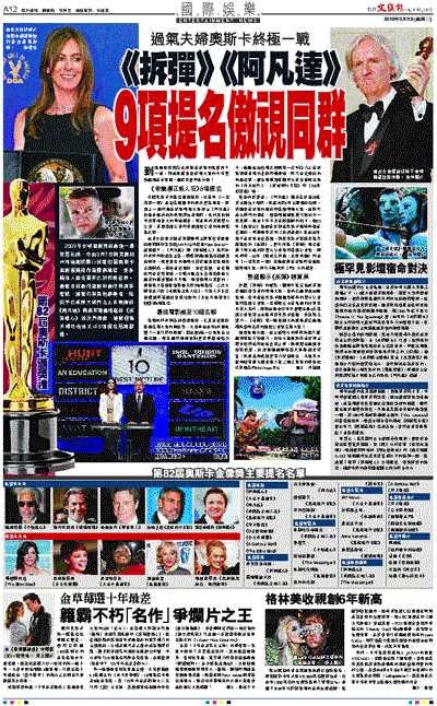 2009年全球電影界的最後一場榮譽比拼,可由3月7日假美國加州柯達劇院舉行的第82屆奧斯卡電影頒獎禮作為圓滿總結,而各獎項入圍名單亦已於昨晚發表。最矚目的最佳電影和最佳導演爭奪戰,儘管仍有其他參賽者,但似乎已成兩大熱門占士金馬倫的《阿凡達》與嘉芙蓮碧格露的《拆彈雄心》的決鬥局面,這對過氣夫婦巧合地又以9項提名冠絕群雄。