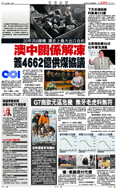 澳洲礦業公司源庫資源(Resourcehouse)昨日宣布,與中國電力國際發展有限公司達成一項總值600億美元(約4,662億港元)的供煤合約,形容這是澳洲歷來最大宗出口合約。西方媒體認為,今次交易顯示中澳經過去年連串礦業風波後,兩國外交緊張關係開始解凍。