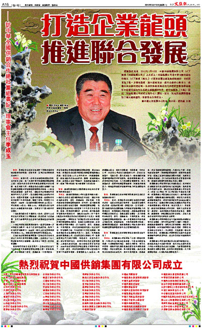 經國務院批准,2010年1月18日,中國供銷集團有限公司(以下簡稱「供銷集團公司」)正式成立。供銷集團公司是中華全國供銷合作總社(以下簡稱「總社」)以原有直屬企業為基礎組建的,目的就是為了進一步整合資源,擴大規模效益,提升企業核心競爭力,推動社有企業快速發展。在加快構建新農村現代流通經營服務網絡建設中發揮供銷合作社系統企業龍頭的作用,更好地服務「三農」。因此,供銷集團公司的成立格外引人關注。近日,記者就相關問題專訪了總社黨組書記、理事會主任李成玉。
