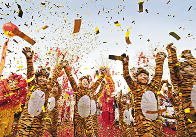 在北京龍潭廟會上,眾「虎娃」賀新春。 美聯社