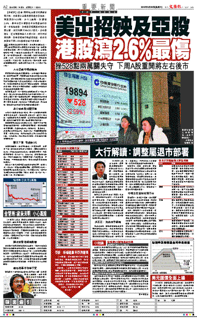 受美國調高貼現利率拖累,美元周五全線走高,商品價格及亞太區股市昨近全線下挫。港股裂口低開161點後,約一小時便跌穿2萬點大關,之後指數徐徐下滑,一度跌穿19,900點水平,低見19,874.55點,全日收報19,894點,大跌528點,跌幅2.6%為區內之最,10天、20天和200天線齊齊失守。國指收報11,263點,下跌337點,跌幅2.91%。統計全周,由於春節假期的關係,港股本周只有3日市,3日累計下跌1.9%。