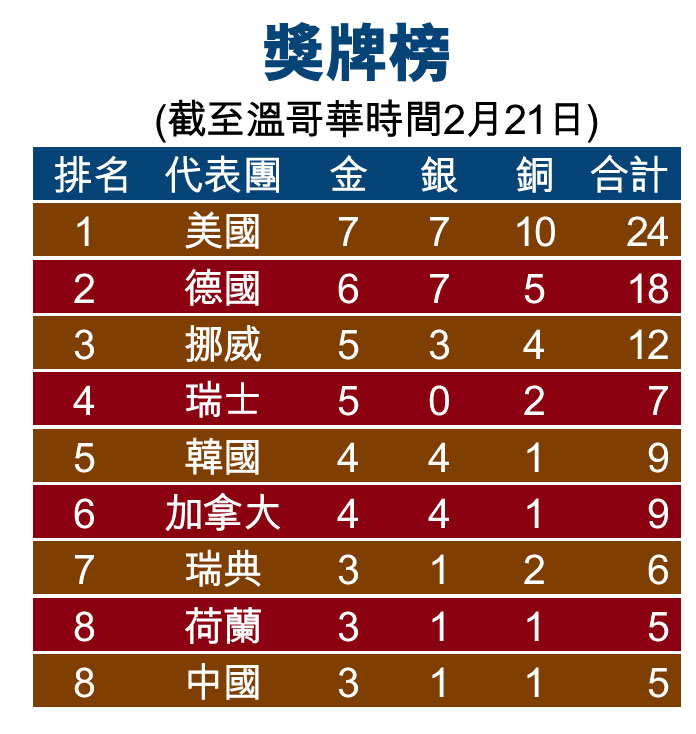 獎牌榜(截至溫哥華時間2月20日) (2010-02-22) (圖)