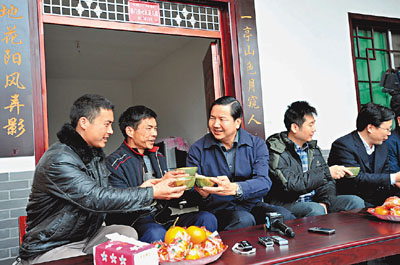 ■張裕(中)和元山村民喝茶聊天。本報四川傳真