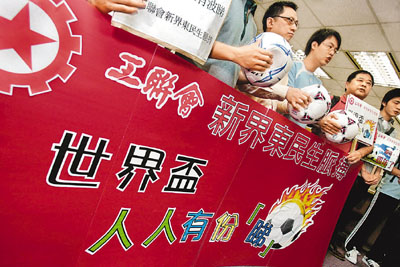 ■工聯會到影視及娛樂事務處請願,要求廣管局介入,令3間電視台能就世界盃播映問題重新談判,確保市民可免費觀賞。 本報記者梁祖彝 攝