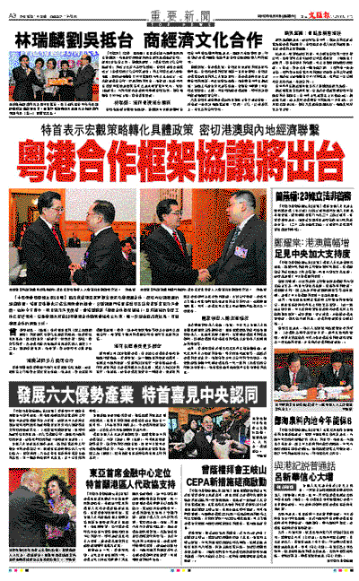 【本報兩會報道組北京5日電】國務院總理溫家寶提出要深化粵港澳合作,密切內地與港澳的經濟聯繫。特首曾蔭權此次借出席兩會的機會,分別與澳門特首崔世安及廣東省委書記汪洋會面。他於今午表示,明日與汪洋見面時,會特別談到「粵港合作框架協議」。目前協議的制定工作已接近完成,這是粵港政府自98年粵港合作聯席會議成立以來,第一份經由國務院批准、有關粵港合作的綱領文件。