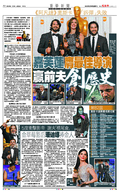 基本上整晚各主要獎項的得主都是意料之內,唯一冷門是最佳外語片由阿根廷代表《謎情追兇》奪得,打破兩大強手《白色恐懼》與《先知》事前壟斷的局面,這亦是相隔25年再有阿根廷片勝出本獎。璜荷西金賓利拿領獎時借《阿凡達》來搞氣氛:「代表著台前幕後,我想多謝大會沒考慮Na'Vi是種外語。」而且外語片獎向來都是歐洲片佔優,今次最後五強竟有兩套南美片,連金賓利拿也坦言「很多先入為主觀念已成碎片」。 ■文:iBot