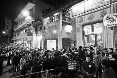 農曆正月廿六日是一年一度的觀音開庫大日子,紅磡觀音廟、銅鑼灣大坑蓮花宮及筲箕灣天后廟等供奉觀音的廟宇,按照傳統在昨晚11時起開放給善信向觀音借庫。其中,紅磡觀音廟最受歡迎。踏正晚上11時,排在廟門外的善信一擁而上,眾人手持祭品,誠心向觀音奉上三炷清香,然後再到庫屋抽取大利是。有善信指借庫銀碼多寡屬其次,最希望祈求闔家平安,有善信則希望香港可以減少爭拗。本報記者曾慶威 攝
