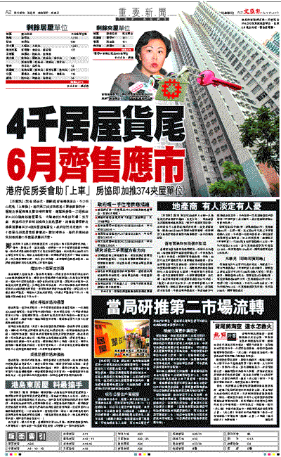 為幫助港人圓置業夢,鄭汝樺昨宣布,房委會於本月底討論出售約4,000個剩餘居屋單位,港府會向資助房屋小組建議一次過推出市場發售,增加中小型單位供應,預計最快6月推出市場。房協昨午亦宣布一次過推出夾屋貨尾單位,分別位於葵涌浩景臺、何文田欣圖軒及將軍澳疊翠軒共374個剩餘夾屋單位。疊翠軒早前開售的464個單位,原訂3月22日截止遞交申請表,現因加入其他夾屋單位,將截止申請延至下月7日,而抽籤日期亦順延至下月22日。