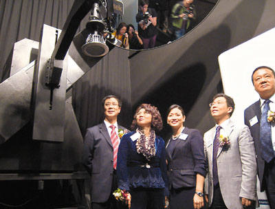 ■有公證行設立LED全面性檢測中心,並購入全港首個C類追蹤反射鏡式光度分佈機,為LED燈光線分布作準確檢證。圖左2為創新科技署署長王榮珍。本報記者嚴敏慧 攝