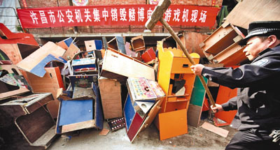 19日,在河南省許昌市魏都區一廢品收購站內,許昌市警方通過人工分解、鏟車擠壓的形式「環保」銷毀在打擊賭博專項行動中收繳回來的268台賭博機。 新華社