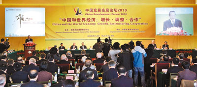 ■由國務院發展研究中心主辦的中國發展高層論壇2010年會開幕式21日在北京舉行。本屆年會主題為「中國和世界經濟:增長.調整.合作」。 新華社