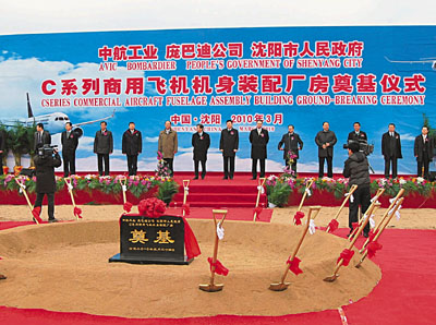 C系列商用飛機是目前世界上唯一一種針對100-149座級進行最佳設計的飛機。這次開工建設的機身裝備廠房項目總建築面積6.14萬平米,將於2011年交付首架零部件,達產後產值50億元。中航工業瀋陽飛機工業(集團)有限公司總經理羅陽表示,C系列飛機是中航工業瀋飛與龐巴迪公司合作研製生產的新型飛機,是目前中航工業公司承接的合作程度最深的項目,從設計製造取證到售後服務,全程參與其中,是中航工業與龐巴迪幾十年合作歷史中一座新里程碑。