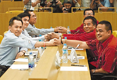 ■阿披實(左2)首次與紅衫軍領袖面對面談判。 路透社