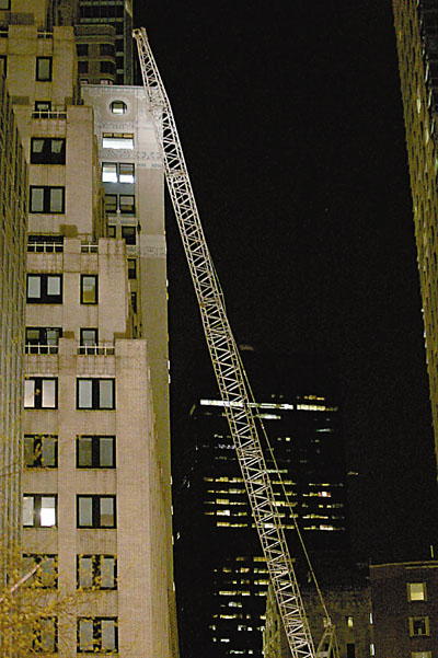前晚約7時半,一部無人操作的巨型起重機吊臂突然鬆脫,擊中仕女巷80號的25層高大廈。當局封鎖水街至百老匯的一段仕女巷,以及弗萊徹街至華爾街的一段珍珠街,又疏散4棟大廈,包括一棟住宅。