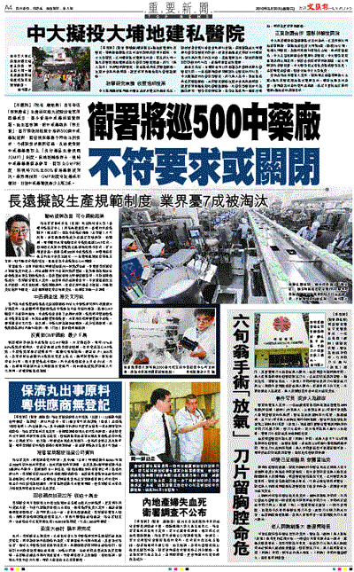 【本報訊】(記者 嚴敏慧)百年老店「李眾勝堂」生產的保濟丸被驗出含禁用西藥成分,揭示香港中成藥的監管問題。衛生署強調,對中成藥絕非「無王管」,署方稍後將巡查全港約500間中成藥製造商,若發現有藥廠不符合法例要求,不排除要求廠商結業,長遠更會對中成藥藥廠設立「良好藥品生產規範(GMP)」制度。有檢測機構表示,現時中成藥藥廠質素參差,若設立GMP制度,料現時70%至80%香港藥廠被淘汰。業界則預期,GMP制度令製藥成本增加,日後中成藥售價最少上漲2成。