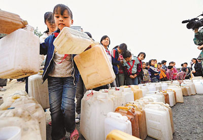 天峨縣是廣西特旱區之一,迄今為止,持續的秋、冬、春連旱導致全縣4.51萬人飲水困難。圖為納沙小學的同學在排隊等候送水的消防車。 新華社