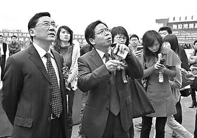 ■廈門市委書記于偉國(左一)聽取海滄區長林國耀介紹海滄灣規劃 本報記者米南 攝