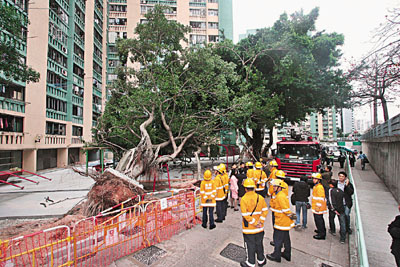 受強烈季候風影響,本港昨晨颳起偏東強風,陣風時速高達70公里,昂坪360纜車昨晨亦一度須暫停服務約3小時。而何文田愛民h一株10多米高大樹,凌晨疑抵不住強風吹襲連根拔起倒塌,幸無人受傷,因塌樹位置為工地,無影響居民,屋h辦事處未有即時報警。至昨中午約12時,有居民見大樹倒塌地上報警,消防員到場調查證實無人被困及受傷,收隊離去。