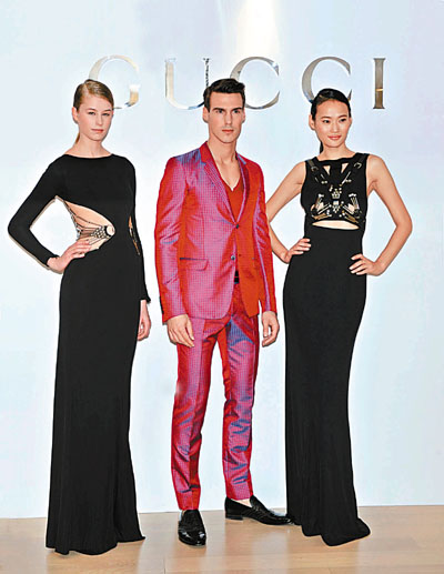 ( 圖左 ) 黑色腰間鏤空長裙 $ 34,800。( 圖中 ) 紫紅色西裝外套 $ 29,980、襯衣 $ 4,550、西褲 $ 9,890。( 圖右 ) 金屬配飾黑色長裙 $ 34,800 ( Gucci )