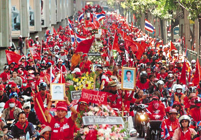 車隊由集會場地繁華橋遊行到王家田廣場,期間途經總理府門外,示威者高呼阿披實下台,軍警則在前方戒備,雙方並無衝突。 ■泰國《民族報》/《曼谷郵報》/綜合外電消息