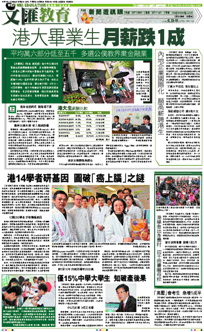 【本報訊】(記者 劉美顏)港大昨公布09年畢業生就業調查報告結果,受金融海嘯影響,一向是天之驕子的港大畢業生亦不能倖免,平均月薪為16,625元,較08年急降2,130元,幅度達11.4%。至於月薪1萬元或以下者,也比去年增加逾10個百分點,部分更只有5、6千元。以往好景時,港大不時產出年薪過百萬的超高薪畢業生,且多從事金融業,但09年最高薪者年薪縮水至90多萬元,是理學院出身,獲儀器生產公司聘任。