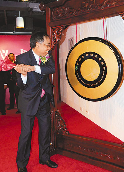 ■中國證監會副主席桂敏傑為滬深300股指期貨合約上市鳴鑼。新華社