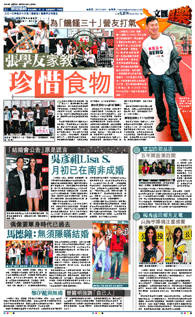 【本報訊】(記者 黃佩麗)「饑饉三十2010」昨日在香港仔運動場舉行,兩位饑饉之星謝安琪和朱薰及一眾「饑饉天使」包括鄧麗欣、鍾舒漫、陳偉霆、Mr.等齊齊出席開幕禮。活動由運輸及房屋局長鄭汝樺、香港世界宣明會總幹事趙煥明、商台副主席俞琤等擔任主禮嘉賓,並帶領眾人宣讀饑饉宣言及進行敲鑼儀式,代表活動正式開始。大會更請來張學友為眾營友打氣,學友即場清唱兩首歌《祝福》和《OVER THE RAINBOW》,令營友更加精神煥發。