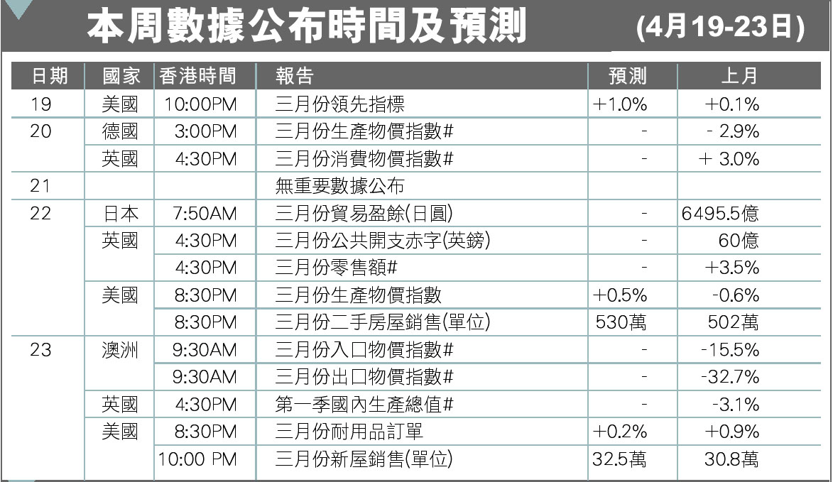 本周數據公布時間及預測(4月19-23日)