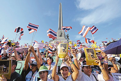 ■黃衫軍示威者聚集在曼谷英雄紀念碑,揮國旗及泰王海報。 法新社