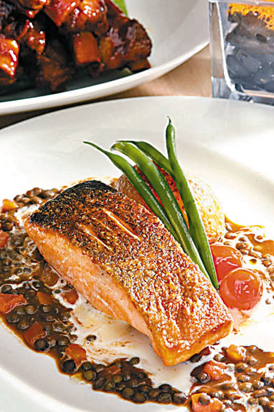 脆皮三文魚配蘋果蘭刀豆醋汁 $128(b)