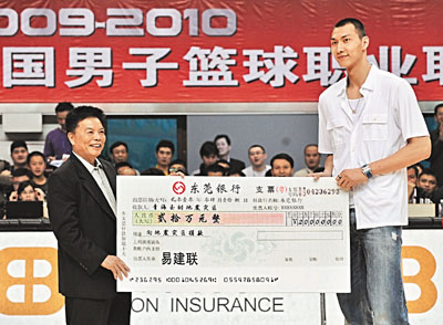 ■易建聯(右)向玉樹地震災區捐款20萬元人民幣。新華社