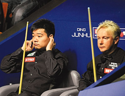 ■丁俊暉(左)為何堵住雙耳? 新華社
