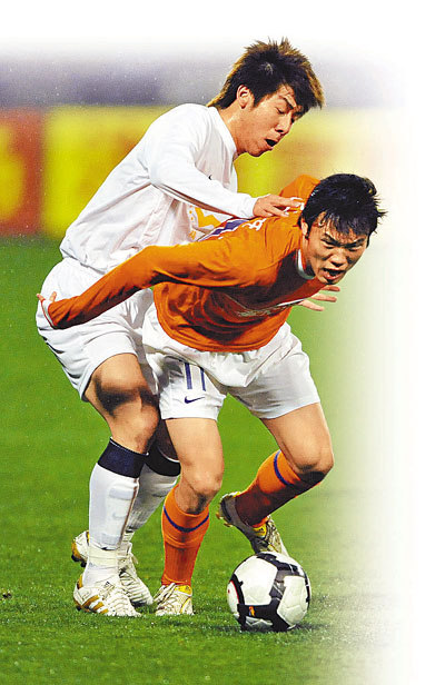 ■魯能球員鄧卓翔(右)突破防守。 新華社