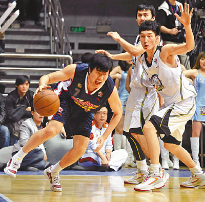 ■廣東球員王仕鵬(左)帶球進攻。 新華社