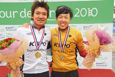 【本報訊】2010年環韓單車大賽,22日在韓國南部濟州島展開。在首站全長177公里的繞圈賽中,香港選手楊英翰獲得冠軍,穿上黃色領騎衫,老將黃金寶第二。