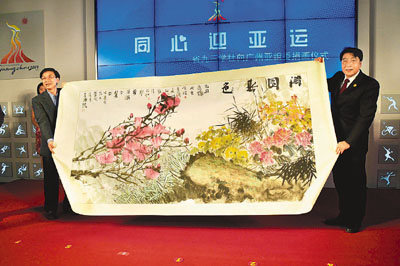 九三學社廣東省委員會書畫院八大畫家聯合創作的8尺國畫《滿園春色》捐贈給亞組委。據悉,早在今年1月,九三學社便開始策劃向亞運會捐畫活動,並邀請黃唯理、劉基青、宣新明、賈博鴻、李長松、張偉、鍾瑞和、李東川等八名專業畫家聯合創作,完成作品《滿園春色》。