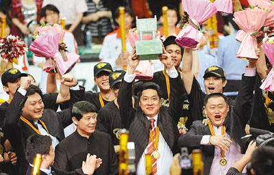 ■廣東隊主教練李春江(中)高舉總冠軍獎盃。新華社