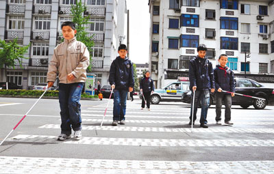 蘇州市交巡警部門近日在蘇州十梓街醋庫巷前設置了一條盲人斑馬線,為附近蘇州市盲聾學校的盲人學生及周邊盲人出行提供方利。圖為蘇州市盲聾學校的學生在通過盲人斑馬線。 新華社