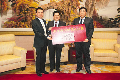 金沙中國有限公司今日捐出300萬澳門元支援青海玉樹地震的災民,由金沙中國有限公司行政總裁翟國成代表,將善款捐贈予澳門中聯辦,由經濟部部長級助理李春滿代表接受,善款將透過中聯辦轉交給青海玉樹地震災區。